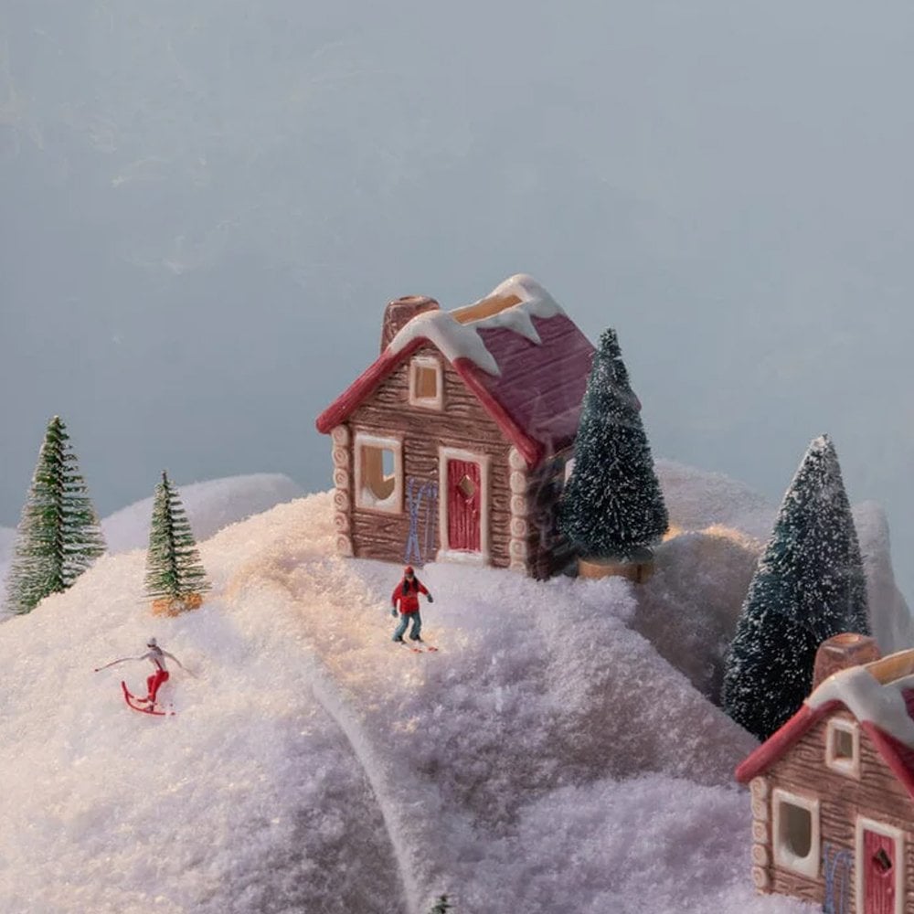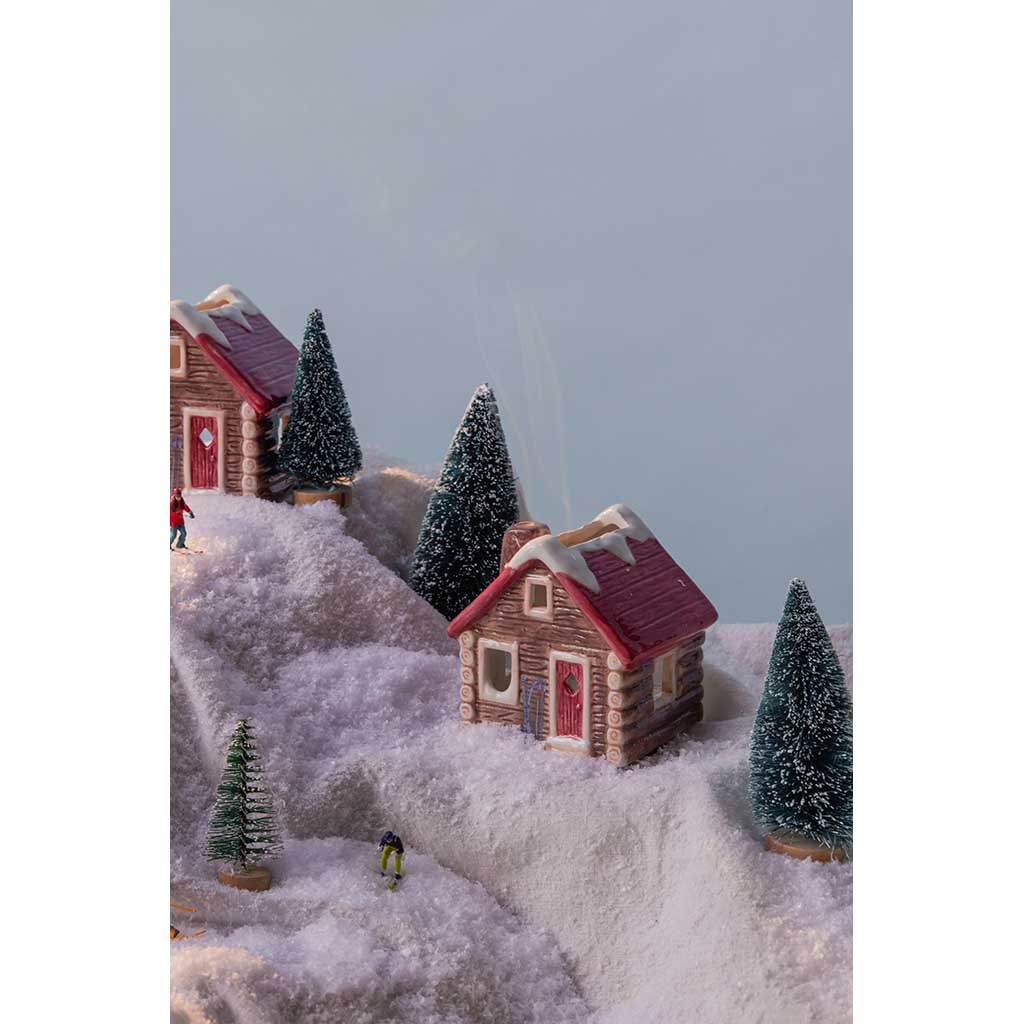 The Alpine Chalet Incense House & Tea Light Holder captures the rustic charm of a mountainside cabin. Artisanally designed, illustrated artwork is hand-painted onto ceramic to resemble an Alpine Chalet during ski season. It is intended to accommodate either an incense cone or tea light, making it a versatile and functional decor piece. Each house is intentionally crafted for incense smoke to smolder through the chimney, and for candlelight to flicker through the windows, perfect for creating a warm and inviting atmosphere.